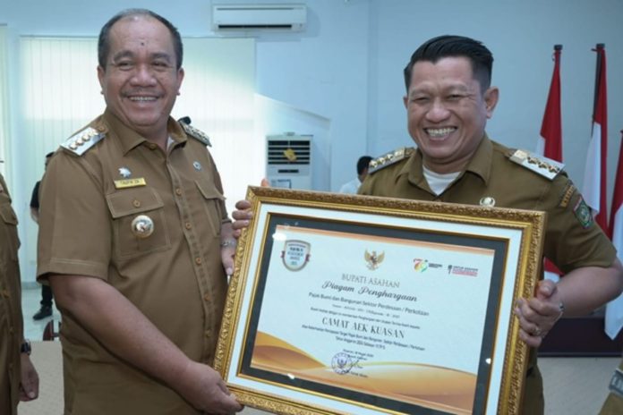 Sebagai rangkaian acara, dilakukan penyerahan piagam penghargaan kepada Kecamatan dan Desa berprestasi dalam pengelolaan dan realisasi SPPT PBB-P2 Tahun 2024 yang memperoleh peringkat 1, 2 dan 3 untuk Camat Aek Kuasan, Camat Sei Dadap, Camat Rahuning dan untuk Kepala di Desa memperoleh peringkat 1, 2 dan 3 di Antaranya Kepala Desa Alang Bombon Kecamatan Aek Songsongan, Kepala Desa Perkebunan Sei Dadap I/II Kecamatan Sei Dadap dan Kepala Desa Air Teluk Kiri Kecamatan Teluk Dalam. (Khalis)
