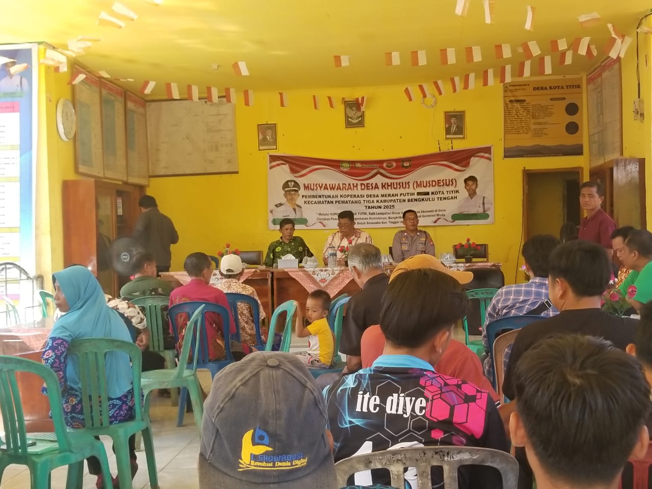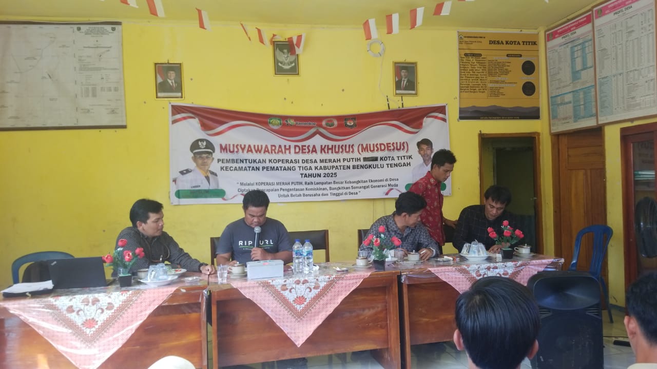 Bengkulu Tengah. Sentralnews.com – Desa Kota Titik kembali menunjukkan komitmennya dalam memajukan ekonomi desa dan memberantas kemiskinan melalui pelaksanaan musyawarah desa (Musdesus) guna Pembentukan Koperasi Merah Putih Desa Kota Titik Kecamatan Pematang III Kabupaten Bengkulu Tengah Provinsi Bengkuluyang dilaksanakan pada Rabu (15/5). Acara ini dihadiri oleh berbagai pihak penting, seperti Camat Pematang Tiga, Mades Maesa, Kepala Desa Muslim, Kasi PMD Kecamatan, serta tenaga ahli pendamping desa.
