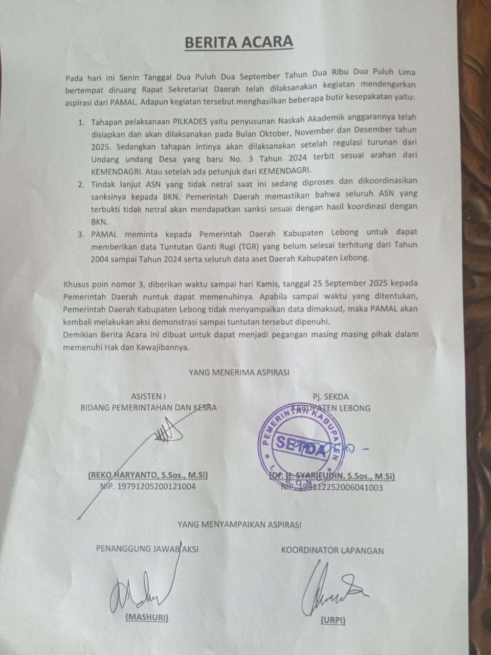 Poin yang paling krusial muncul ketika PAMAL menuntut Pemkab Lebong segera menyerahkan data lengkap terkait Tuntutan Ganti Rugi (TGR) yang belum terselesaikan sejak 2004 hingga 2024, serta data seluruh aset daerah.