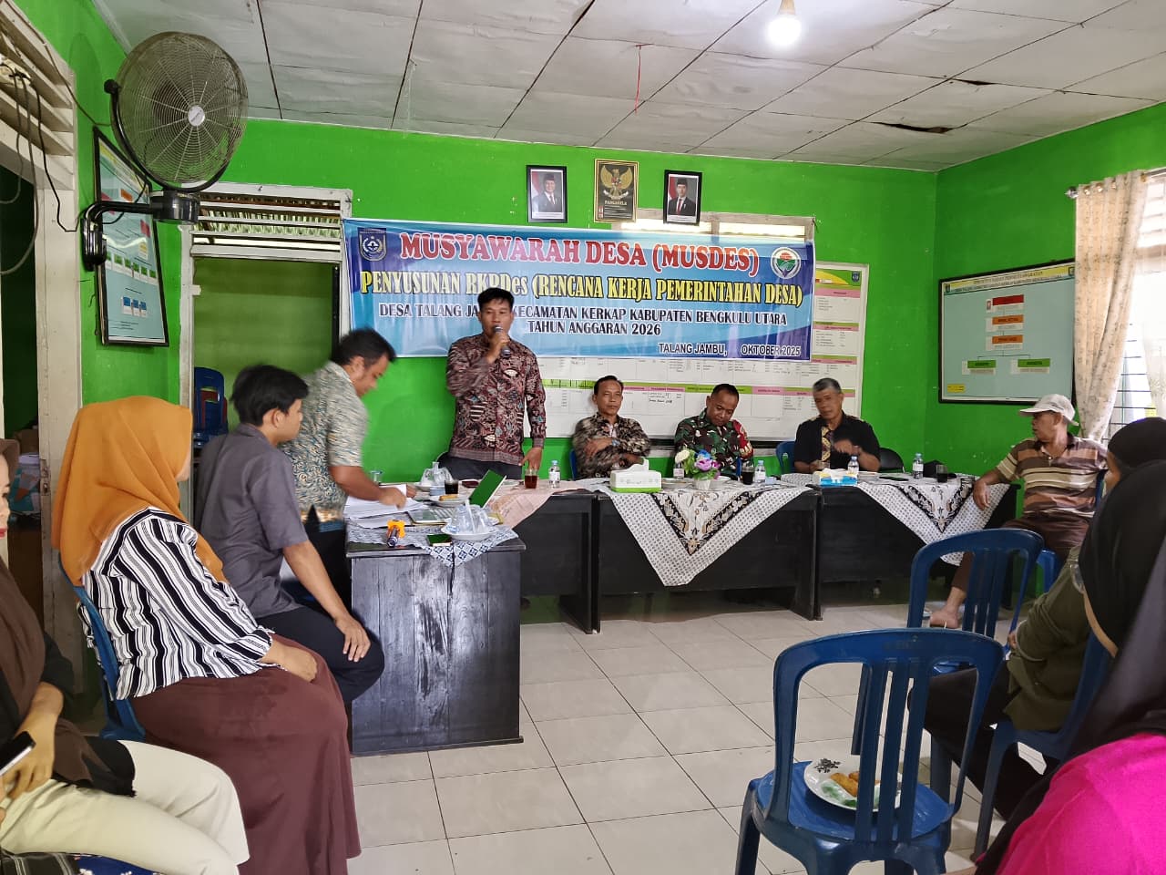 Bengkulu Utara, Sentralnews.com – Pemerintah Desa Talang Jambu, Kecamatan Kerkap, Kabupaten Bengkulu Utara, menggelar Musyawarah Desa (Musdes) dalam rangka penyusunan Rencana Kerja Pemerintah Desa (RKPDes) Tahun Anggaran 2026, pada Rabu (30/10/2026), bertempat di Kantor Desa Talang Jambu.