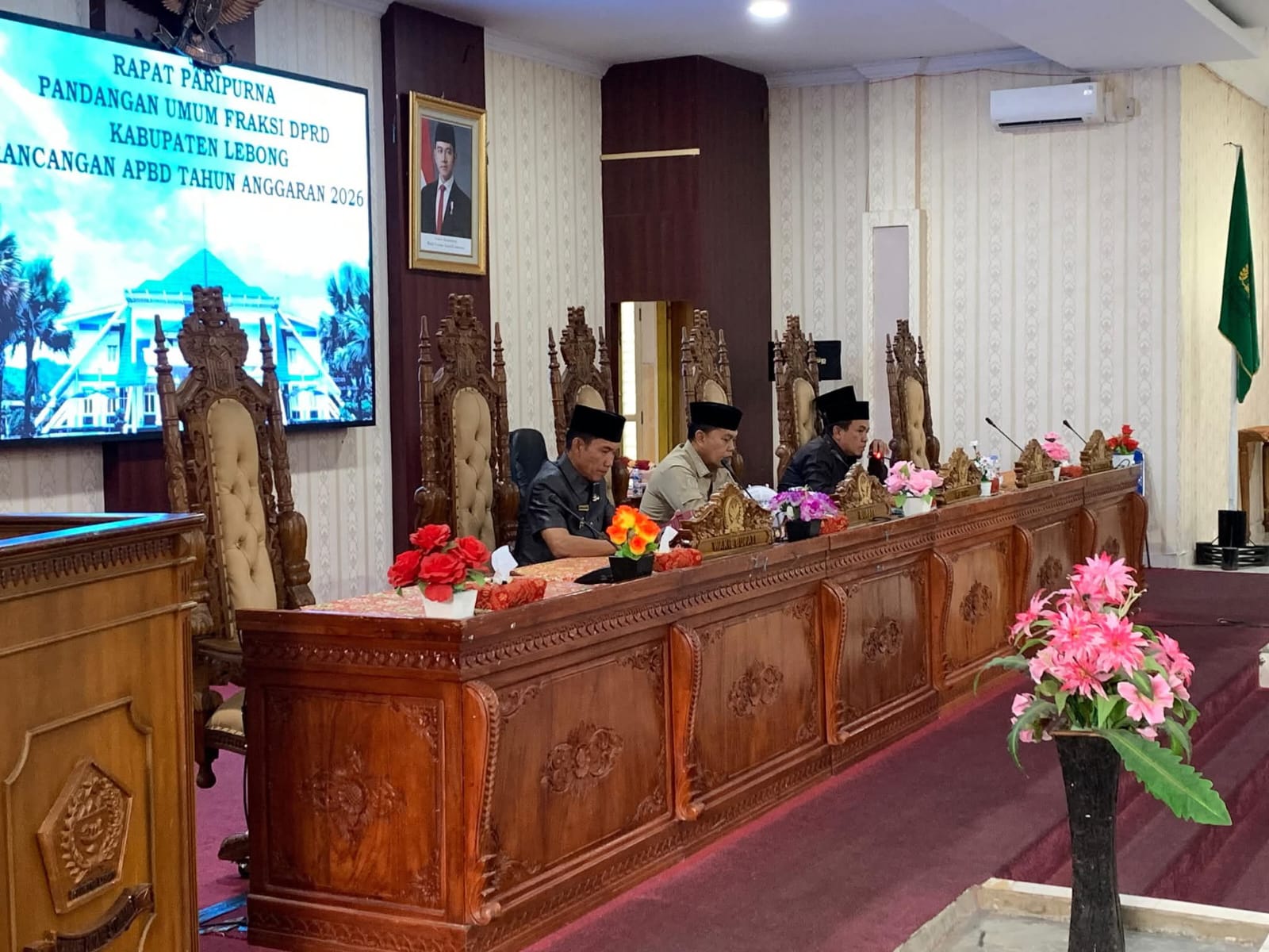 Dalam Rapat Paripurna DPRD Kabupaten Lebong tersebut, dengan agenda Penyampaian Pandangan Umum Fraksi-Fraksi dan Jawaban Eksekutif terhadap Rancangan APBD Tahun Anggaran 2026, yang digelar di Ruang Rapat Paripurna DPRD, Kamis (06/11/2025).