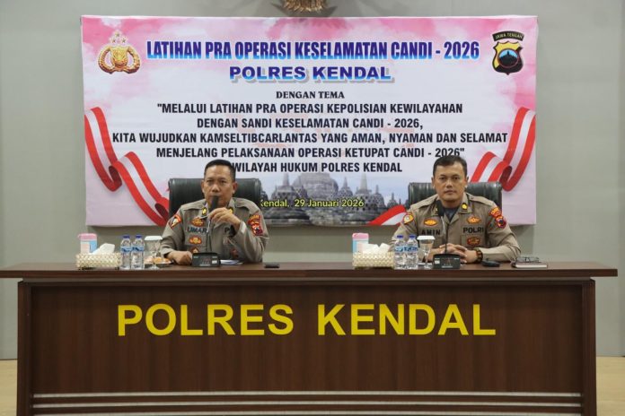 Kendal, Sentralnews.com – Menjelang pelaksanaan Operasi Ketupat Candi 2026, Polres Kendal menggelar kegiatan Latihan Pra Operasi Keselamatan Candi 2026. Kegiatan ini berlangsung di Aula Tri Brata Polres Kendal pada Kamis (29/01/2026) pagi, dengan mengusung tema “Melalui Latihan Pra Operasi Kepolisian Kewilayahan Dengan Sandi Keselamatan Candi – 2026, Kita Wujudkan Kamseltibcarlantas Yang Aman, Nyaman dan Selamat”.