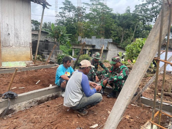 Terlihat anggota satgas yang sebagian mengenakan seragam loreng bersama warga desa sedang duduk bersama di sekitar pondasi rumah yang tengah dibangun. Meski lokasi kerja terlihat sederhana dengan bahan bangunan yang tersebar rapi, suasana kebersamaan terasa hangat saat mereka berbincang santai