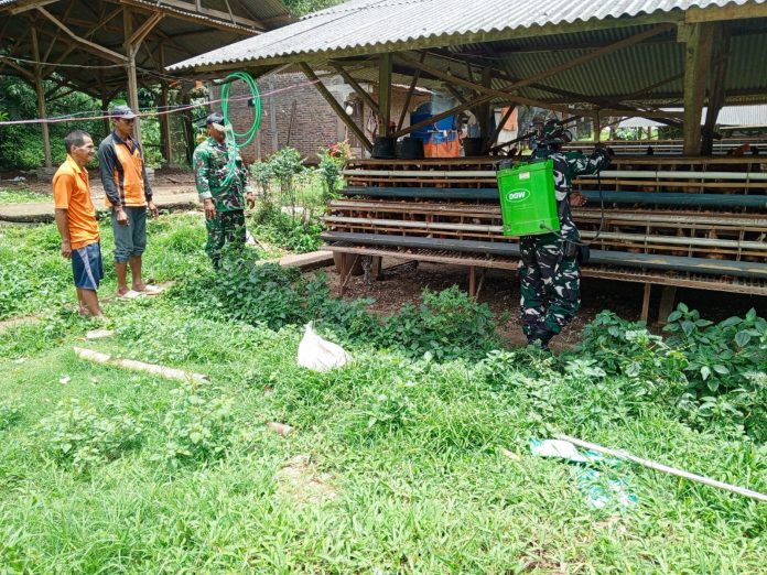 Satu diantaranya adalah penyemprotan cairan prebiotic pengurai kotoran ayam di kandang milik salah satu warga peterna ayam petelor milik supeno, “Tujuan penyemprotan cairan pengurai ini untuk mengurangi bau kotoran ayam pada kendang sehingga, tidak menganggu warga sekitar”, terang sertu budionoa anggota satgas TMMD.