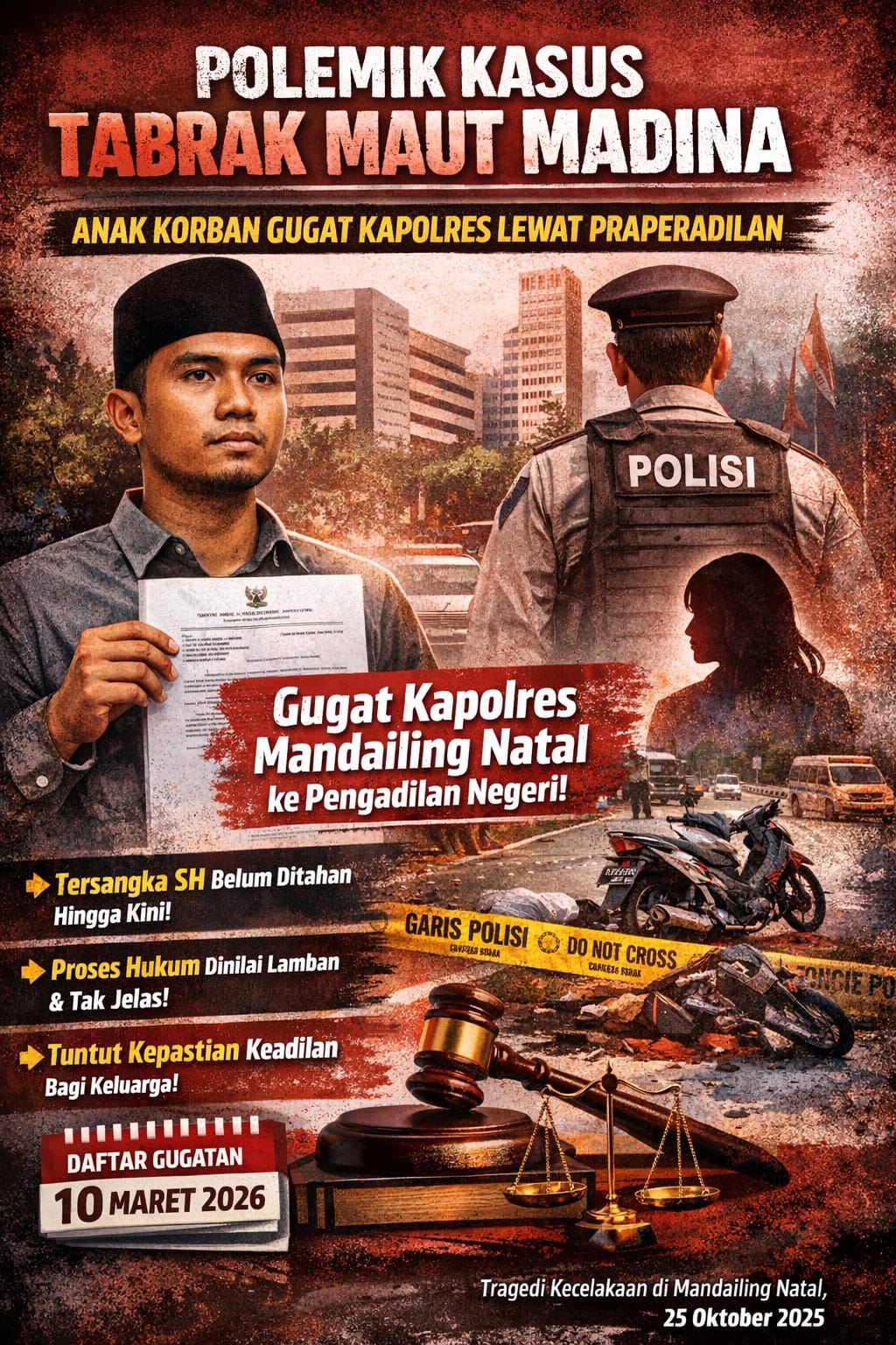 Mandailing Natal, Sentralnews.com – Penanganan kasus kecelakaan lalu lintas yang menewaskan Khoiriah Harahap di Kabupaten Mandailing Natal (Madina), Sumatera Utara, menuai polemik. Anak korban, Abdul Azizul Hakim Siregar, resmi mengajukan gugatan praperadilan terhadap Kapolres Mandailing Natal ke Pengadilan Negeri Mandailing Natal.