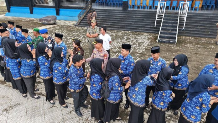 Usai apel dan sambutan, acara dilanjutkan dengan tradisi bersalaman antara pegawai dan pimpinan daerah sebagai simbol saling memaafkan.