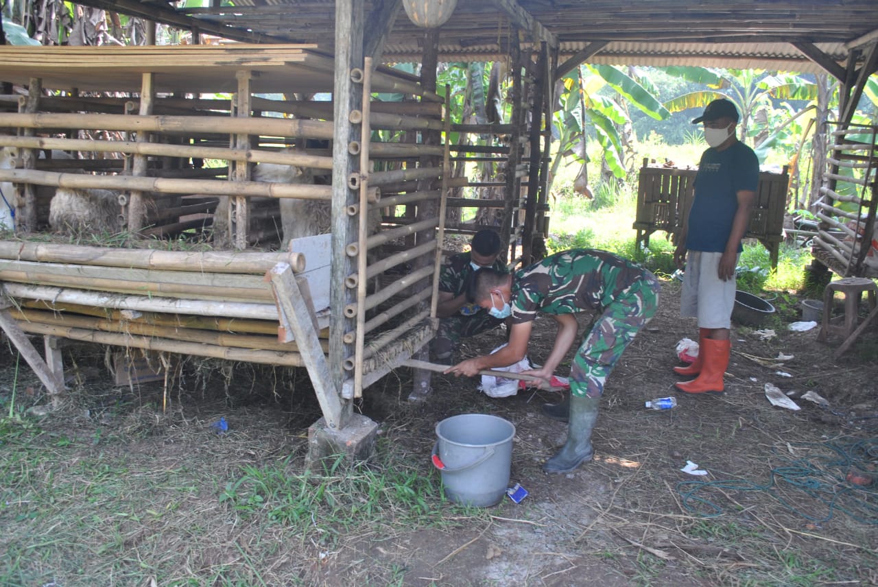 Anggota Satgas TMMD Ke 111 Jambe Membantu Warga Membersihkan Kandang Kambing